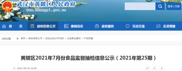 中国质量新闻网讯 2021年9月16日,武汉市黄陂区人民政府网站刊登2021年7月份食品监督抽检信息公示(2021年第25期)。公示信息显示,黄陂区市场监督管理局开展区本级食品安全监督抽检工作,委托湖北洁源检测有限公司依据国家相关标准进行检验。现将2021年7月份食品安全监督抽检结果进行公示如下:
