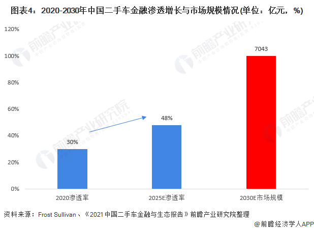 我国二手车金融开始步入规范化发展阶段。展望未来,在中国经济“双循环”新格局和“十四五”发展新要求之下,以二手车为核心的汽车流通产业作为稳增长、扩内需重点领域,将具备重要的战略意义。因此《2021中国二手车金融与生态报告》中提到,2020年,我国二手车金融渗透率达30%左右,预计2025年可达48%左右。据分析机构Frost & Sullivan预测,随着二手车消费在汽车总消费中的占比增加,预计到2030年,中国二手车汽车金融市场规模将达到7043亿元。
