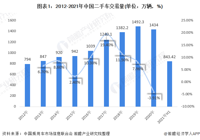 近年来,我国二手车交易活跃,中国二手车交易量已经连续18年持续增长,全国交易量从37万辆增长至2019年的1492.3万辆。但2020年由于疫情影响,中国二手车交易量首次出现下滑,据中国乘用车市场信息联合会统计数据公布,2020年我国累计完成交易二手车1434万辆,累计同比下降3.91%。2021年上半年,我国累计完成交易二手车843.42万辆,同比增幅为52.89%;即便是在6月份这样的汽车行业销售淡季,二手车的交易量依然有着4.43%的环比增长。