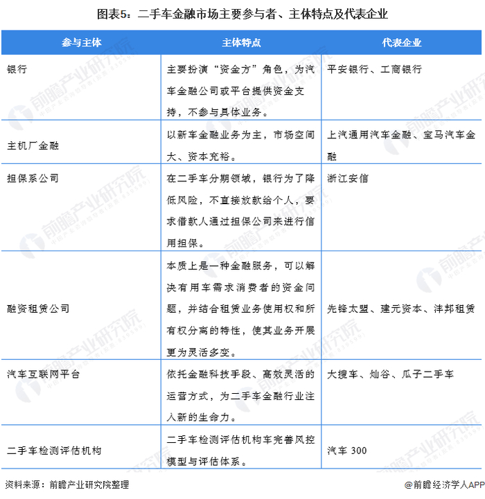 由于我国二手车交易量逐年增加,在大众消费者的热情持续高涨和政策利好的双向促进下,我国二手车金融市场拥有巨大想象空间,导致大批玩家纷纷涌入。当今二手车金融市场的玩家主要分为五大类:以平安银行、工商银行为代表的银行机构;以上汽通用汽车金融、宝马汽车金融为代表的主机厂金融公司;以浙江安信为代表的信用担保公司;以先锋太盟、建元资本、沣邦租赁为代表的融资租赁公司;以大搜车、灿谷、瓜子二手车为主的互联网汽车交易平台。