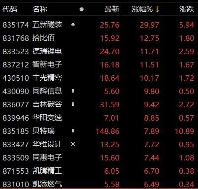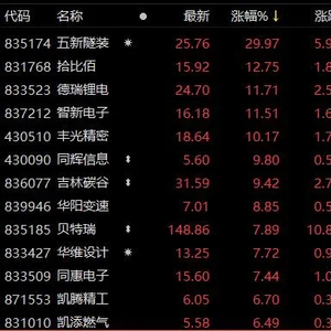 精选层股票今日整体走强,多只挂牌不久的个股涨幅居前,其中五新隧装强势涨停,此外拾比佰、德瑞锂电、智新电子等4只个股涨逾10%。