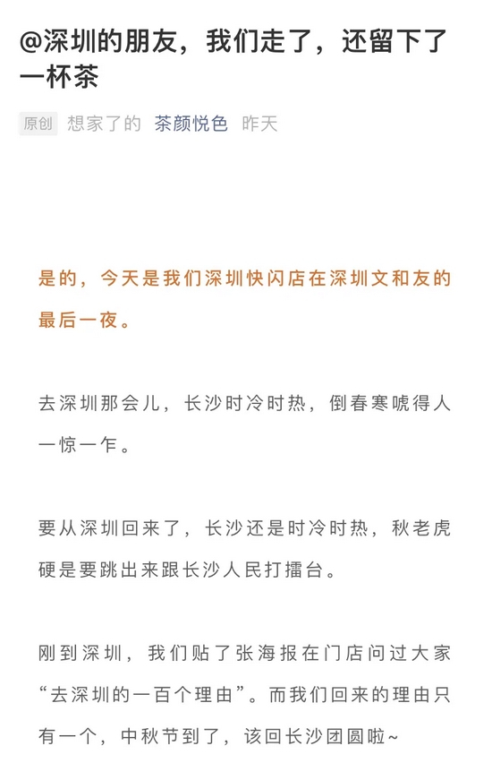 9月15日,网红奶茶品牌茶颜悦色在其微信公众号上正式官宣——告别深圳!