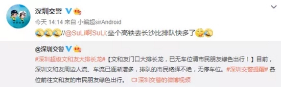 当时一度火爆到深圳交警发文,“请市民朋友绿色出行。”有网友更是调侃称,坐个高铁去长沙都比排队快多了。