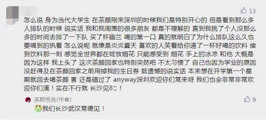 9月15日,茶颜悦色微信公众号上发布的告别文阅读量也达到10万+,足可见茶颜悦色在年轻人心中的分量。有网友称:“茶颜悦色离开深圳后,我发誓不再为喝奶茶排队了”;更有不少人在评论中写“小作文”表达了不舍之情。