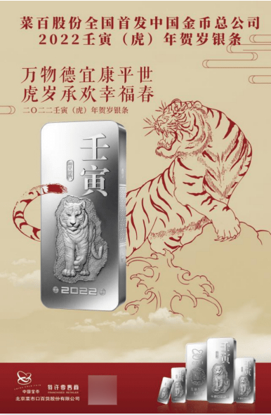2021年9月17日,菜百股份(605599.SH)作为中国金币总公司特许零售商全国首发2022壬寅(虎)年贺岁银条。据悉,本次贺岁银条由中国金币总公司发行,深圳国宝造币有限公司铸造,上海金币投资有限公司总经销的,在菜百股份(605599.SH)总店、部分分店及菜百京东、天猫旗舰店全国首发。这是继2008戊子(鼠)年银条后连续发行的第十五组贺岁银条产品。造币工艺铸造,权威机构发行,防伪限量销售。