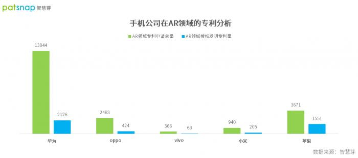 (智慧芽统计的主流手机厂商在AR领域专利布局和授权发明专利占比,来源:智慧芽)