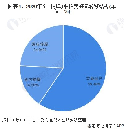 2020年,全国机动车拍卖转籍比例达到40.54%,较去年同比上升3.91个百分点,高于同期全国二手车流通市场转籍比例13.08个百分点。其中,省内转籍占16.50%,跨省转籍占24.0%。