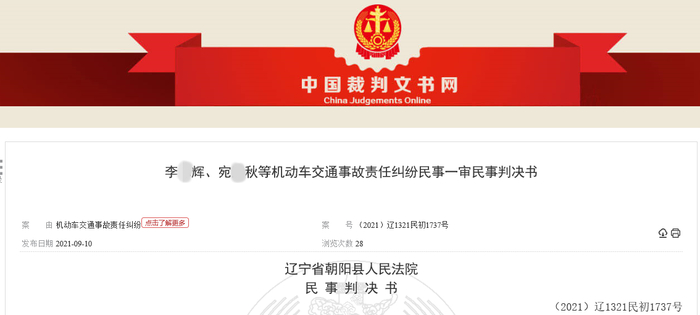 9月10日,中国裁判文书网公示了《李某辉、宛某秋等机动车交通事故责任纠纷民事一审民事判决书》((2021)辽1321民初1737号),裁定书详细披露了本案的相关细节。