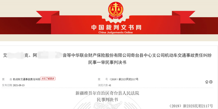 此外,中国裁判文书网于9月13日公示了《艾某克、阿某音等中华联合财产保险股份有限公司奇台县中心支公司机动车交通事故责任纠纷民事一审民事判决书》((2019)新2325民初2117号),裁定书详细披露了本案的相关细节。