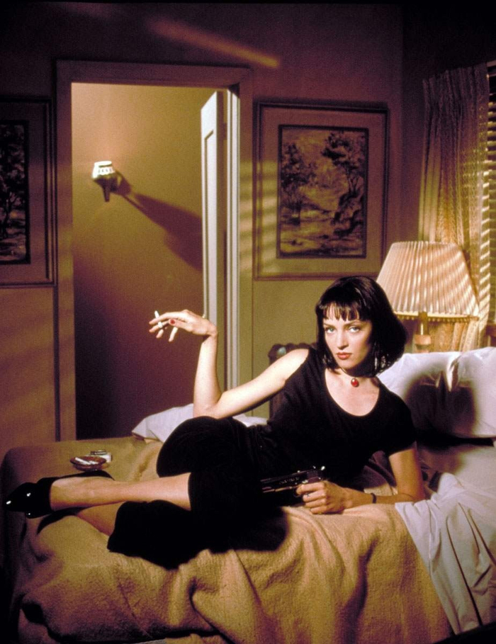 画面上,一袭黑衣的乌玛·瑟曼趴在床上,慵懒的眼神望着镜头的样子,如今已成了当代电影史上最著名的海报形象之一。