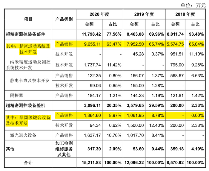 精密运动系统是华卓精科的第一大收入来源,2020年的销售额为9655.11万元,收入占比达63.47%。同期,晶圆级键合设备、激光退火设备、静电卡盘的销售额分别为1364.60万元、1637.17万元、122.35万元,收入占比分别为8.97%、10.76%、0.80%。