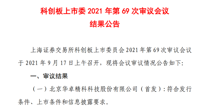 9月17日,上交所发布科创板上市委会议审议结果,北京华卓精科科技股份有限公司(下称“华卓精科”)首发获通过。