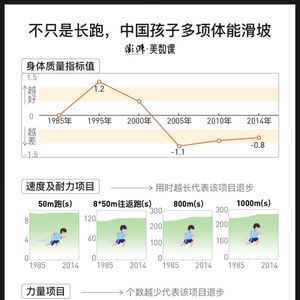 图中的数据来自中国每隔5年开展的学生体质与健康调研。其实不只是长跑,这份有关未来的报告里,描摹了中国孩子的柔韧、力量、速度、耐力等多项体能指标。