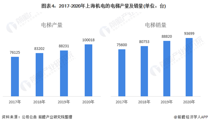 从电梯产品的产销量来看,2017-2020年上海机电电梯产销量呈上升趋势,2020年上海机电电梯产量为100018台,同比上升13.4%。2020年上海机电电梯销量为93699台,同比上升5.5%。