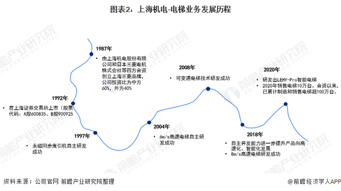 1987年,上海电机股份有限公司与日本三菱电机株式会社合资创立上海三菱电梯品牌,中方投资占比6%,外方占40%;1992年,上海机电已在上海证交所上市;2004年,公司已率先自主研发出6m/s的高速电梯;2011年开始,公司开始向智能化方向发展,2018年成功自主研发8m/s的高速电梯和智能扶梯;2020年成功研发出LEHY-PRO智能电梯。