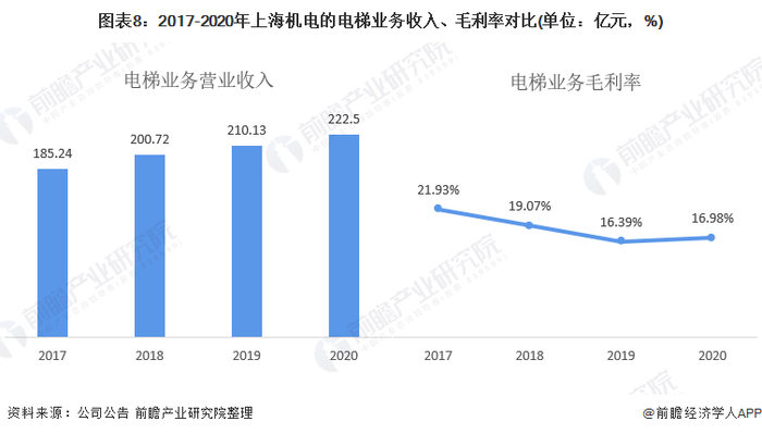 从电梯业务的经营情况来看,2017-2020年,上海机电的电梯业务呈上升态势,2020年上海机电电梯业务营业收入营业收入为222.5亿元。