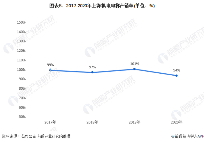 2017-2020年上海机电电梯产品的产销率呈波动态势,2019年上海机电产销率达到101%,为近4年产销率最大值。2020年,上海机电电梯产品产销率为94%,同比下降了7个百分点。
