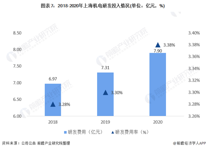 从研发费用投入情况来看,2018-2020年上海机电的研发费用金额及研发费用占比齐上升,2020年研发费用为7.9亿元,同比上升了8.1%;研发费用率为3.38%,较2019年上升了0.08个百分点。