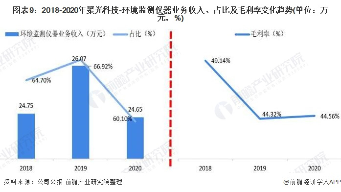 从聚光科技的经营状况来看,2018-2020年,环境监测仪器业务整体呈现波动趋势。2020年,环境监测仪器业务收入为24.65亿元,占总营收收入的60.10%,占比较前两年有所下降,但仍处于主导地位。