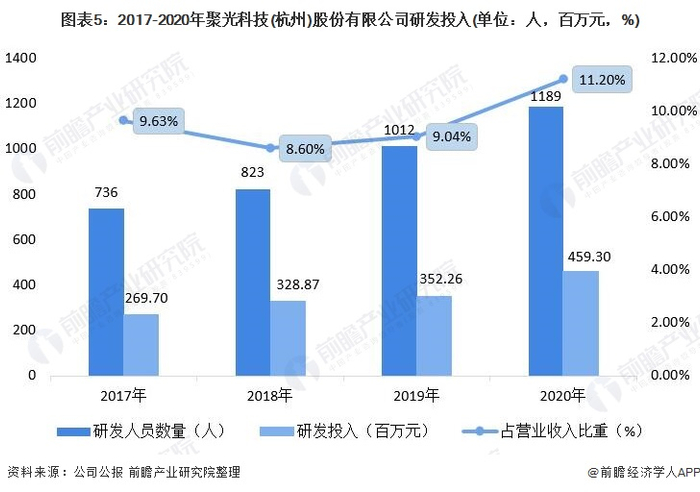 2020年,聚光科技研发人员数量为1189人,相比2019年增加了177人;研发投入为45929.61万元,占总营收收入的11.20%,相比2019年研发投入上涨了30.38%。聚光科技研发投入金额大幅增加,对研发的重视程度不断加深。