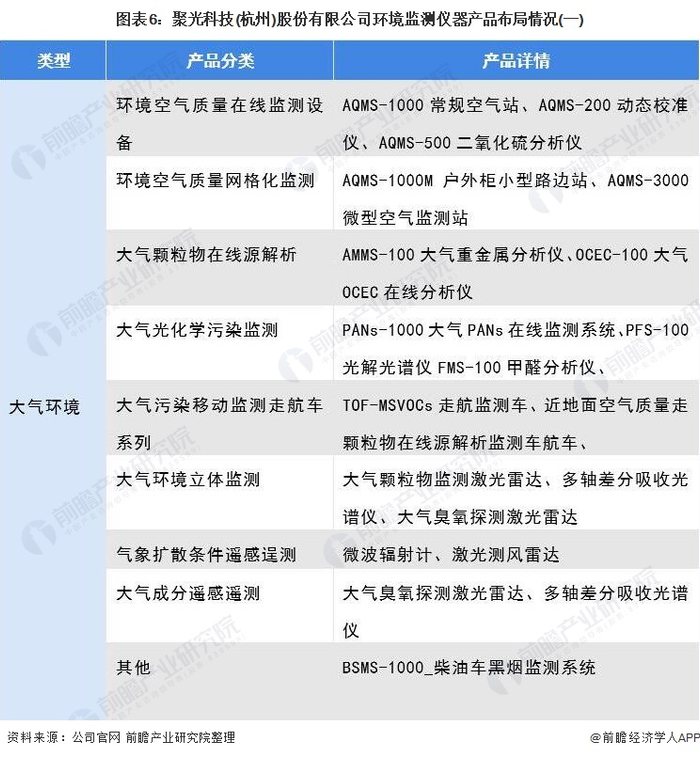聚光科技环境监测仪器相关产品覆盖了大气环境监测、水环境监测、气污染源监测和水污染源监测4大类,31小类,产品类型丰富、覆盖面广。聚光科技针对我国大气监测需求的变化,基于质谱、色谱和湿化学等多个技术平台,推出了大气光化学污染监测、大气颗粒物在线源解析、大气污染物走航监测、化工园区VOCs多路轮巡监测等一系列高端分析仪器及系统;