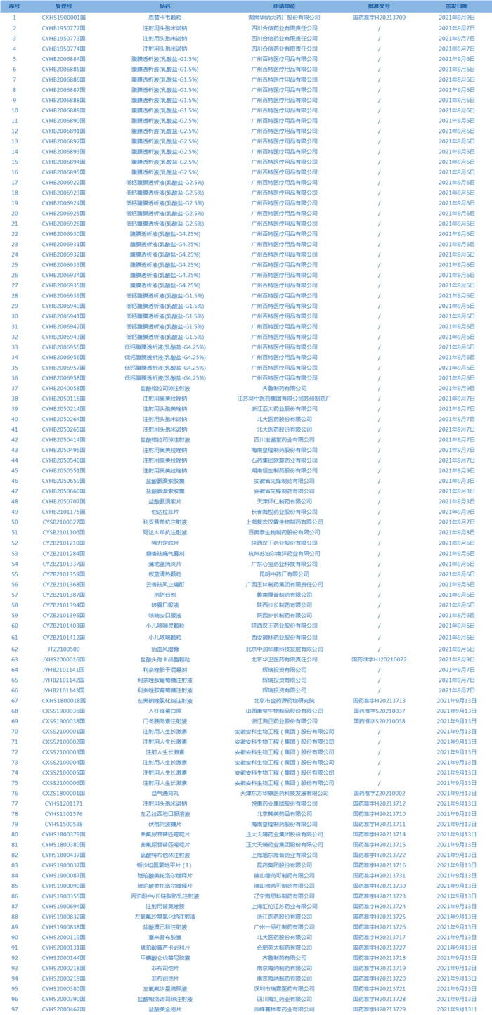 2.国家药监局发布2期药品批准证明文件待领信息,共包括97个受理号,涉及广州百特医疗用品有限公司等企业。(截至9月16日)