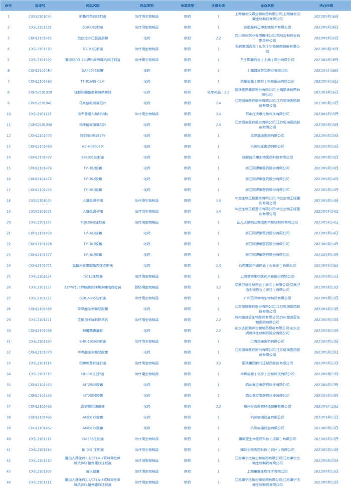 4.CDE承办受理44个新药上市申请,包括斯鲁利单抗注射液等药品。(截至9月16日)