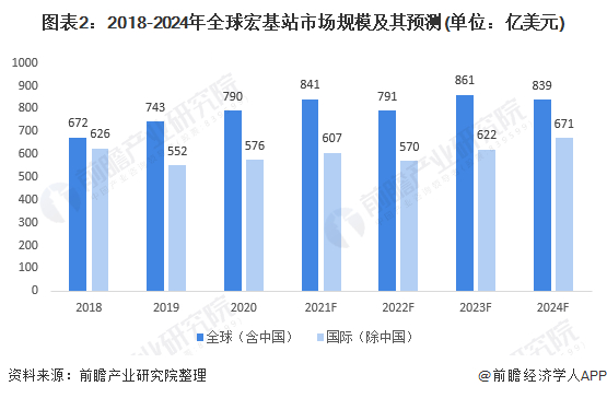 5G基站主要分为宏基站和小基站(包含微基站、皮基站和飞基站)。从全球宏基站市场来看,2020年,全球宏基站的市场规模达到790亿美元,国际(除中国以外)宏基站的市场规模达到576亿美元。