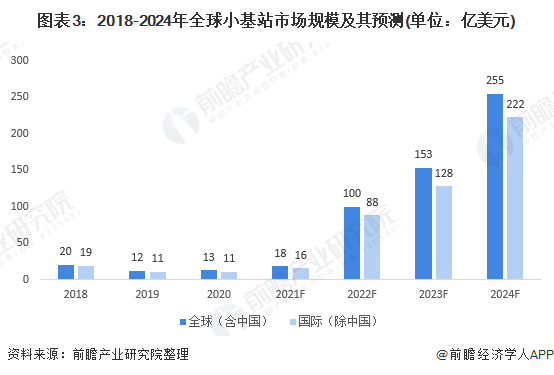 从小基站来看,目前全球小基站市场规模小于宏基站,2020年,全球小基站的市场规模达到13亿美元,国际(除中国以外)小基站的市场规模达到11亿美元。