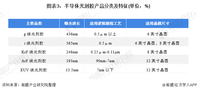 目前半导体光刻胶最常使用曝光波长分类,主要有g线、i线、KrF、ArF和最先进的EUV光刻胶。越先进制程相应需要使用越短曝光波长光刻胶,以达到特征尺寸微小化。