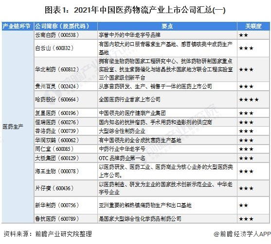 目前,我国医药物流行业的上市公司主要分布在产业链上游(医药生产)及中游环节(医药物流、第三方物流)。产业链上游医药生产主要上市公司有云南白药(000538)、白云山(600332)、华北制药(600812)、贵州百灵(002424)、哈药股份(600664)、复星医药(600196)等,产业链中游医药物流主要上市公司有华润医药(03320)、国药股份 (600511)、中国医药(600056)、南京医药(600713)、上海医药(601607)等,第三方物流上市企业有京东物流(02618)、顺丰控股(002352)等。