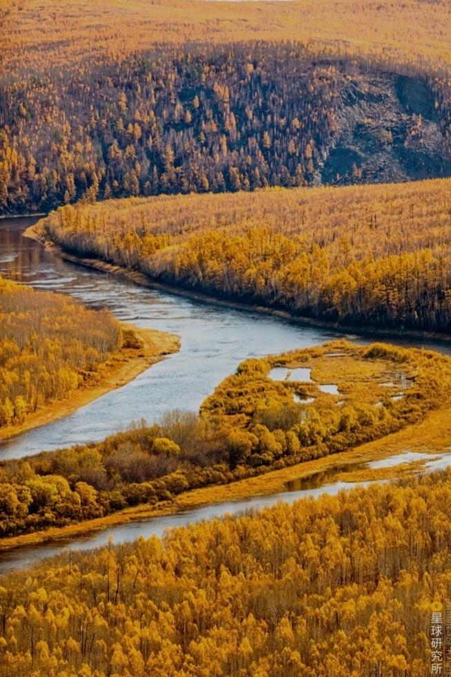 新疆阿勒泰地区布尔津县禾木村,由于山坡坡向的不同,远处的山峰秋色各异,摄影师@焦潇翔