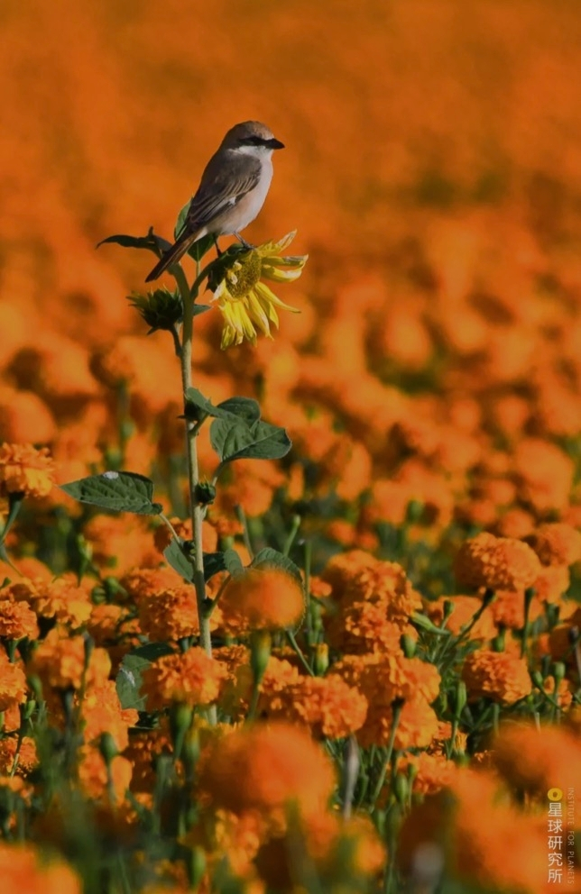 新疆博乐菊花种植园,一只小鸟站在菊花丛中的向日葵之上,摄影师@赖宇宁
