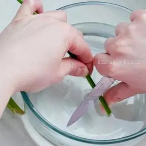 剪切花的茎秆一端浸没在水中,在水下面用剪刀将茎秆剪切去2~3cm即可,水中含气量较低,如此剪切后茎秆中的空隙没有空气进入,不会产生气泡妨碍水分吸收。