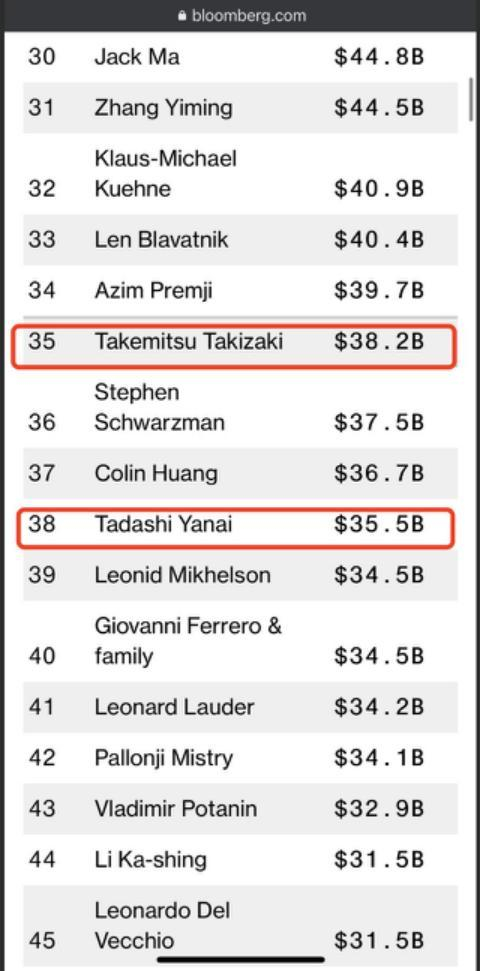 而“时尚帝国”在新冠疫情期间受到了不小打击的柳井正,如今的资产净值为365亿美元,其财富已缩水近五分之一。