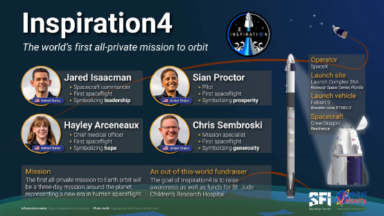 4名乘客分别是亿万富翁贾里德·伊萨克曼、地质学博士和科学传播者锡安·普罗克特、工程师克里斯托弗·森布罗斯基和在童年时期战胜了癌症的海莉·阿西诺。