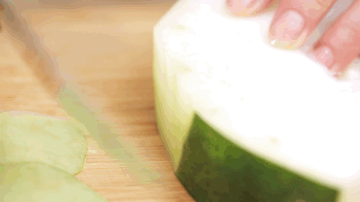 切片的冬瓜看瓜瓤上的经络和纹理,经络粗糙、纹理呈浅绿色且清晰可见的口感较好。