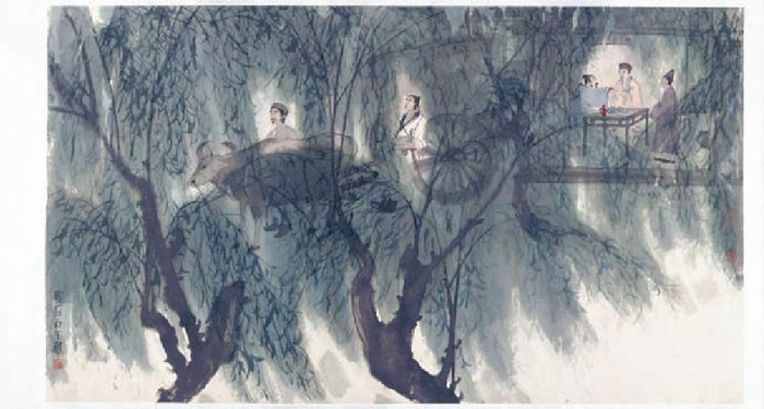 《王维〈渭城曲〉诗意图》横幅,傅抱石绘。此图绘写唐代王维《渭城曲》诗意:“渭城朝雨浥轻尘,客舍青青柳色新。劝君更尽一杯酒,西出阳关无故人。”故宫博物院藏