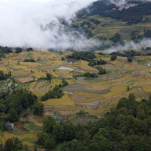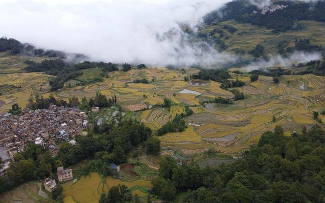 林下有村,村下有田,田的下面,则是变幻无方的云海,仿佛梯田就建在云上。有收割完的小块梯田,水光倒映中,也有云彩在摇曳飘荡。