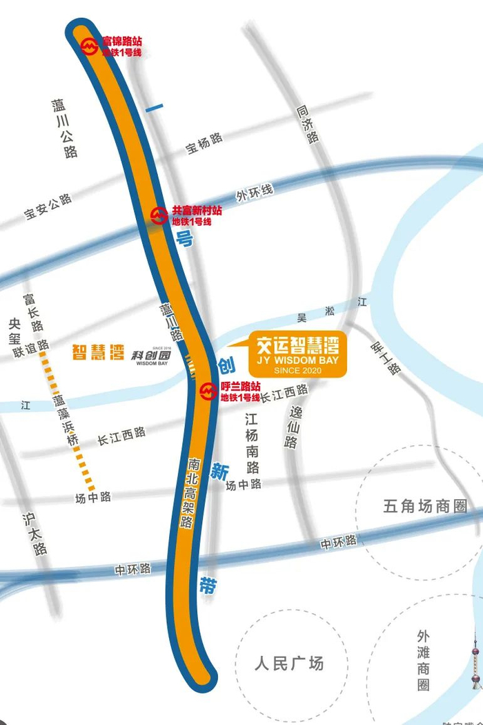 位于共和新路5899号、蕰藻浜南岸的交运智慧湾前身是始建于上世纪的上海市装卸储运总公司码头,随着产业结构调整,老码头闲置、老仓库关闭,七个高达15米的巨大龙门塔吊静静矗立岸边,述说着曾经的辉煌……今年7月1日,1.4公里蕰藻浜庙行区段建成开放,近日跨越共和新路高架东延伸1.2公里张庙区段建成更打开了亲水岸线。城市更新和滨水公共空间提升改造使这里重新被“唤醒”,进入公众视野。