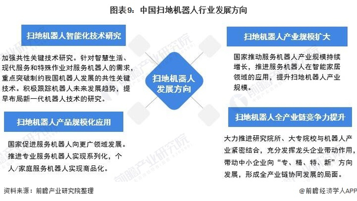 扫地机器人作为服务机器人的一种,正处于产业化加速阶段,具有巨大的发展潜力。根据《国家创新驱动发展战略纲要》和《机器人产业发展规划(2016-2020年)》等政策规划,国家层面将长期推进服务机器人的发展。扫地机器人未来的发展方向有:持续开展扫地机器人智能化技术研究、扫地机器人产业规模扩大、扫地机器人产品规模化应用和全产业链竞争力提升。