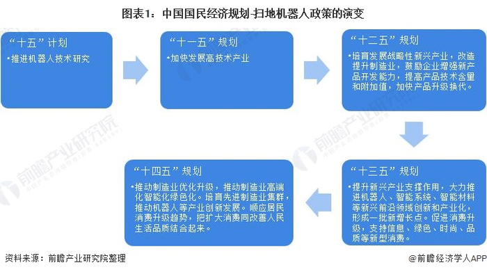 “十五”计划(2001-2005年)时期,国家层面提倡推进机器人技术研究;“十一五”规划中提到加快发展高新技术产业;“十二五”时期,规划明确了要发展战略新兴产业,提高消费产品的技术含量和附加值;“十三五”规划中提到大力支持机器人领域的创新和产业化,并促进消费升级。到“十四五”时期,根据《“十四五”规划和2035年远景目标刚要》,推动机器人等产业创新发展和顺应居民消费升级趋势成为“十四五”时期的重要任务。