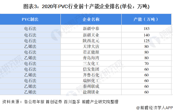 按PVC企业年产能来排名,2020年,中国PVC行业产能排名前三企业分别为中泰化学、新疆天业、陕西北元,均为电石法制造PVC。产能分别为183万吨、140万吨和125万吨。