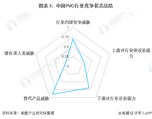 根据以上分析,对各方面的竞争情况进行量化,1代表最大,0代表最小,目前我国PVC行业五力竞争总结如下: