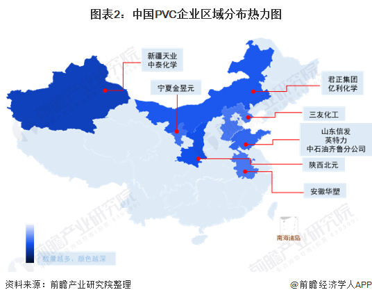 从从地区分布上看,由于各区域的经济水平、资源禀赋和市场情况存在很大的差异,各地PVC产业发展并不均衡,局部地区企业数量众多,产能密集。当前,西北地区依托丰富的资源能源优势,是业内公认的电石法PVC的低成本地区,因此PVC龙头企业多聚集在西北地区。