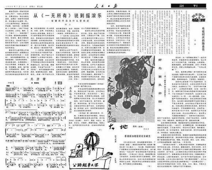 1988年7月16日,《人民日报》第七版左下角刊登了《一无所有》词曲。