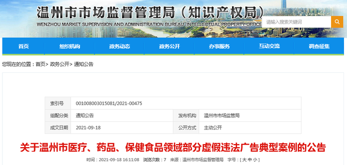 浙江温州市市场监管局发布医疗、药品、保健食品领域部分虚假违法广告典型案例