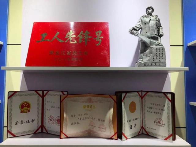 被射灯照得亮堂堂的展厅,摆满了奖状、奖牌和奖杯。年代久远的金属奖牌,氧化出现锈迹,有的奖杯留下了参观者的指纹。十年间,刘丽带领工作室获得技术革新成果1048项。工作室荣获“全国示范性劳模和工匠人才创新工作室”等称号。