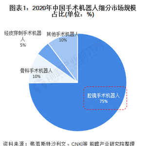 从临床医学应用角度分类。手术机器人可分为腔镜手术机器人、骨科手术机器人、泛血管手术机器人、经自然腔道手术机器人、经皮穿刺手术机器人和其他手术机器人(如神经外科手术机器人)。其中,腔镜机器人是为完成各种复杂的微创手术而设计,目前商业化最为成功,2020年在中国手术机器人中的市场规模占比达到75%,占据主要地位。