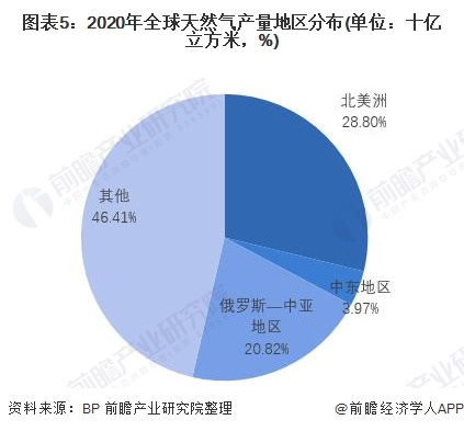 从区域结构来看,根据BP发布的2021版《世界能源统计年鉴》数据,2020年,北美洲天然气产量位居全球量第一,天然气产量为11099亿立方米,同比下降2.1%;中东地区天然气产量为6866亿立方米,同比增长1.0%;俄罗斯—中亚地区天然气产量为802.4亿立方米,同比下降6.8个百分点。